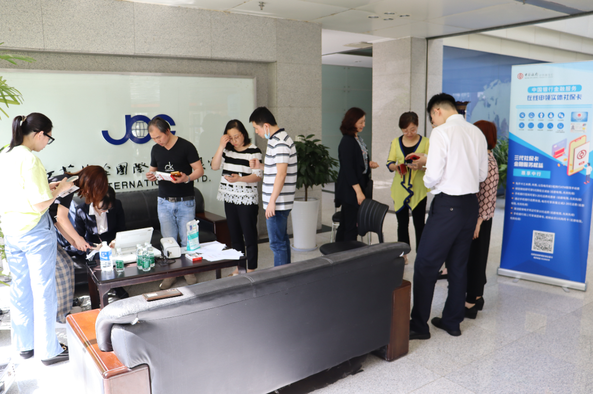 為全面貫徹落實黨和國家重大決策部署,扎實開展“我為群眾辦實事”實踐活動,根據省委、省國資委黨委相關文件精神和集團公司黨委《關于“我為群眾辦實事”實踐活動的實施方案》的要求,5月25日,國際公司黨總支邀請中國銀行中華路支行工作人員到我司江寧辦公基地,為公司有需要升級更換第三代實體社?ǖ穆毠と罕娹k理相關業(yè)務。