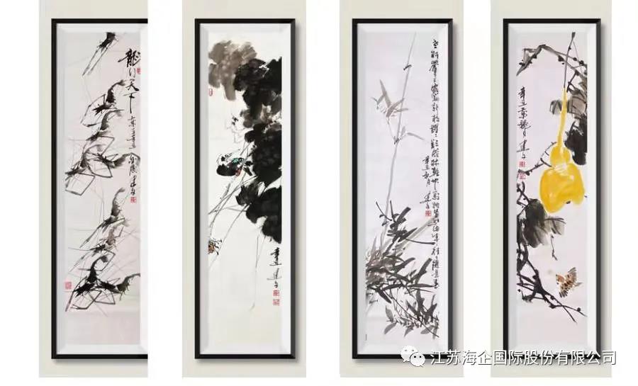 其中,國際公司報送的公司所屬江蘇海企寶德實業(yè)有限公司副總經(jīng)理黃建文同志的四幅國畫作品:《虛心勁節(jié).竹》、《龍行天下.蝦》、《荷塘秋色.荷》和《福祿圖.葫蘆》被集團公司成功評審選中,并在集團河西辦公區(qū)C位展出。