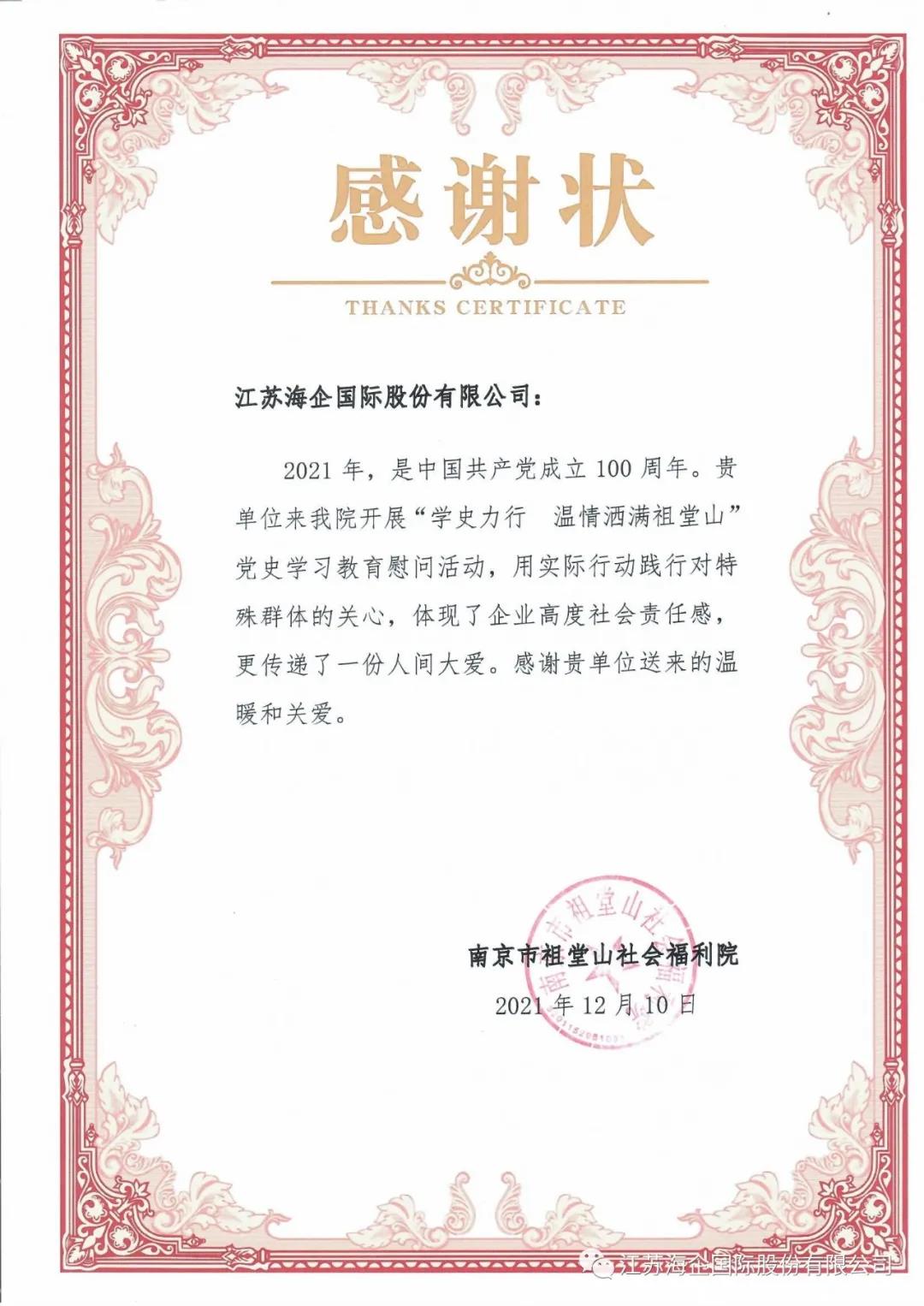 為深入學(xué)習(xí)貫徹黨的十九屆六中全會精神和江蘇省第十四次黨代會精神,切實與人民群眾干在一起、想在一起,踐行與特殊人群風(fēng)雨同舟、同甘共苦,12月10日,國際公司黨總支、長城公司黨總支聯(lián)合江寧區(qū)秣陵街道太平社區(qū)工作人員,前往南京市祖堂山社會福利院開展“學(xué)史力行 溫情灑滿祖堂山”黨史學(xué)習(xí)教育主題黨日慰問活動。