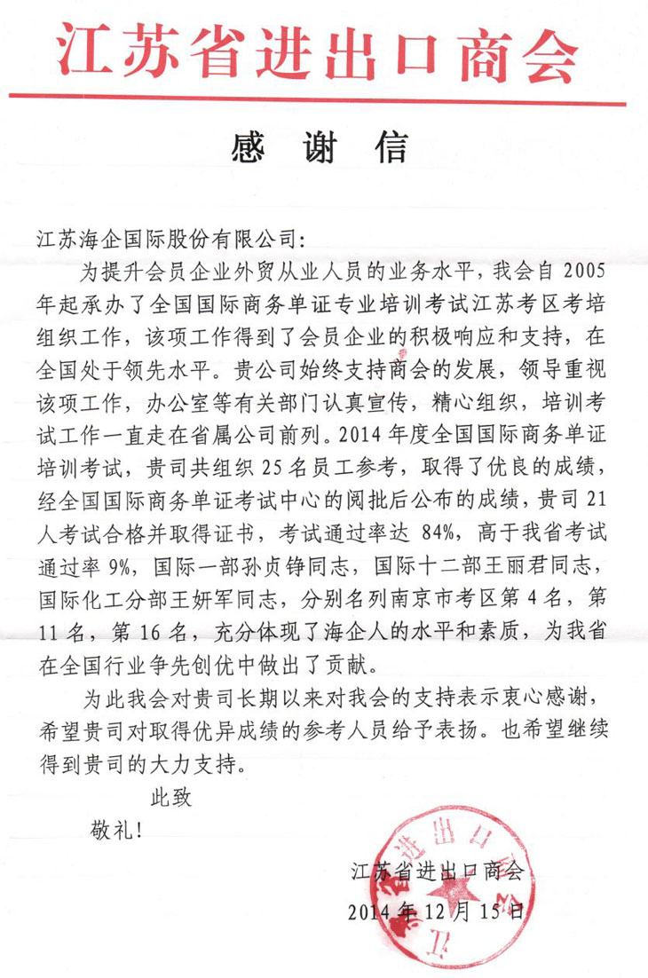 為提升外貿(mào)從業(yè)人員的業(yè)務(wù)水平,近期,我司組織了公司全體單證人員參加了全國國際商務(wù)單證專業(yè)培訓及考試,并取得了優(yōu)良的成績,充分體現(xiàn)了海企人的業(yè)務(wù)水平和專業(yè)素質(zhì),并在全國行業(yè)爭先創(chuàng)優(yōu)中做出了貢獻。